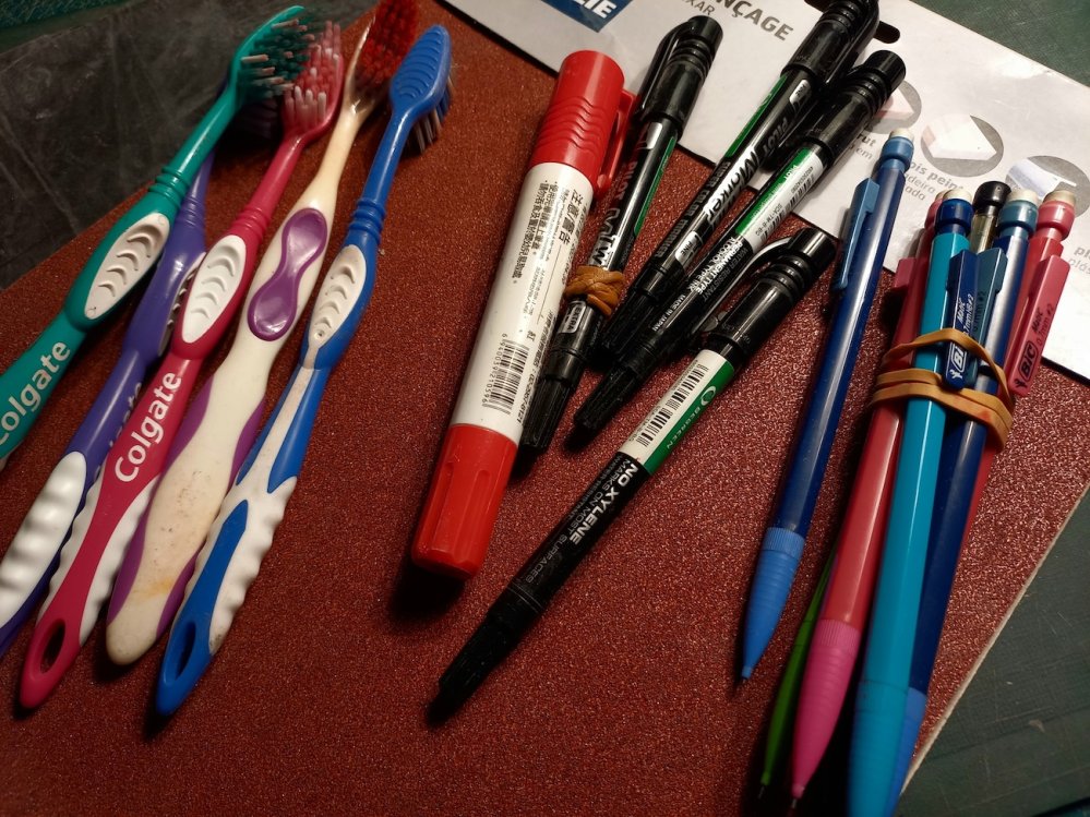 Des crayons noirs, des stylos-feutre indélébiles noirs (il faut que j’en rachète), une gros feutre indélébile rouge, des brosses à dents, du papier de verre en deux densités, un rouleau d’essuie-tout, des feuilles de papier chinois, etc.