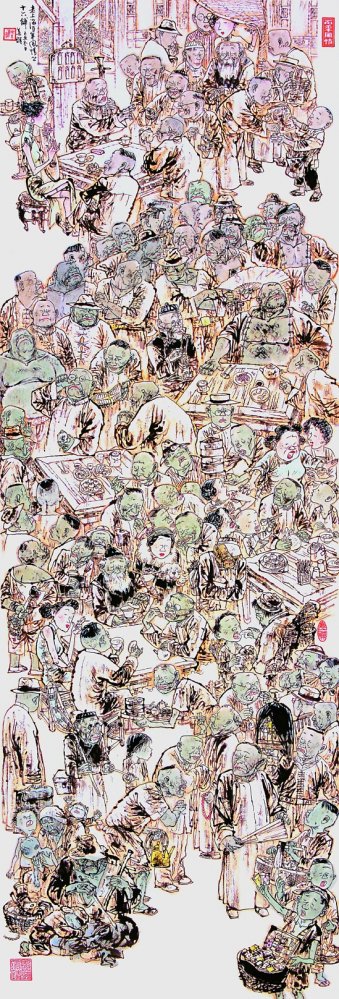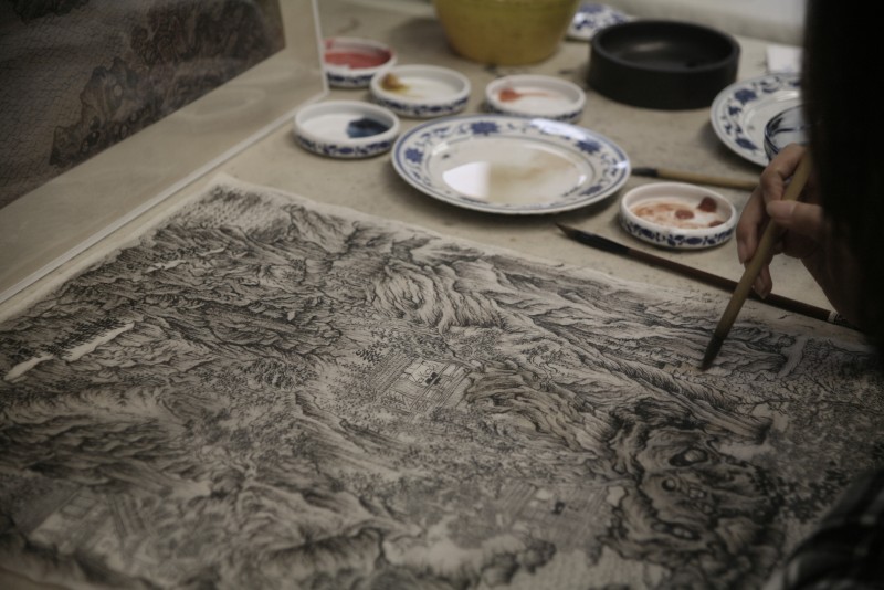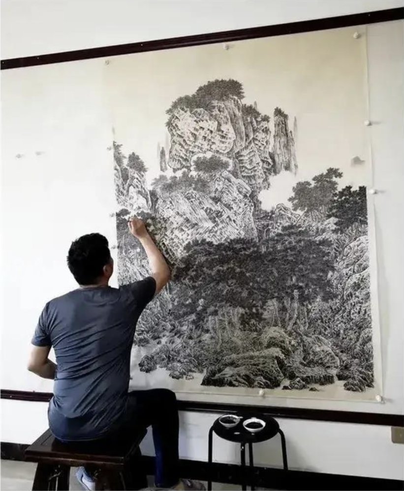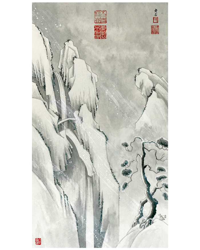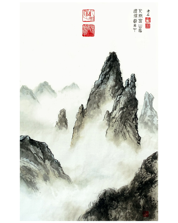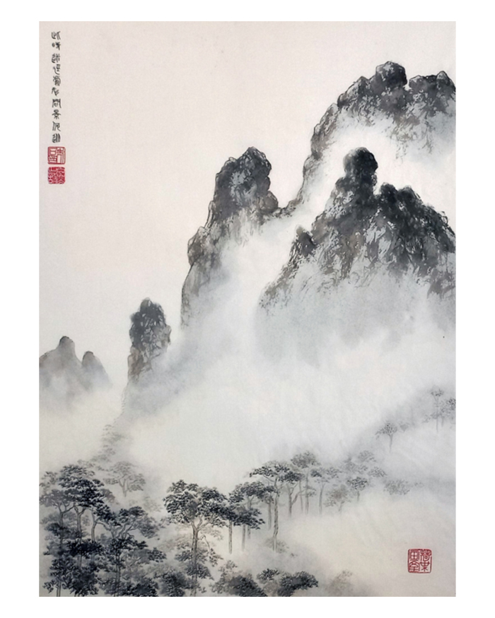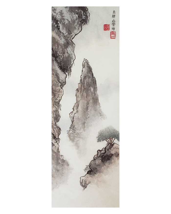 Je peins des paysages à la manière chinoise, tous les jours et en tous lieux. Le plus souvent dans mon atelier avec des pinceaux, de l’encre de Chine, trois couleurs et du papier ; mais aussi dans les transports en commun, les salles d’attente de médecins, les halls de gare et autres endroits inconfortables, avec un simple carnet et un stylo. Je trace des monts abrupts sur lesquels s’accrochent des pins audacieux, des escarpement géants que rayent parfois d’imposantes cascades, des nappes de brouillard et des nuages cotonneux, des bouquets de bambous agités par le vent, des ponts de bois traversant des torrents, des huttes chétives aux toits de palme, des bords de mer déchiquetés, du caillou, de la roche.